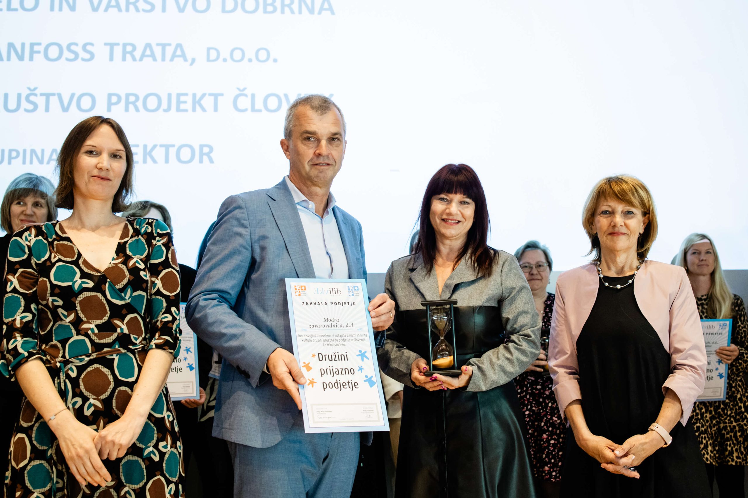Zahvalo smo prejeli, ker s svojo organizacijsko kulturo, politiko in vsakodnevnimi praksami že trinajsto leto ostajamo družini prijazno podjetje. Zahvalo je v imenu Modre zavarovalnice na dogodku Ekvilib Inštituta prevzel član uprave, mag. Matija Debelak.