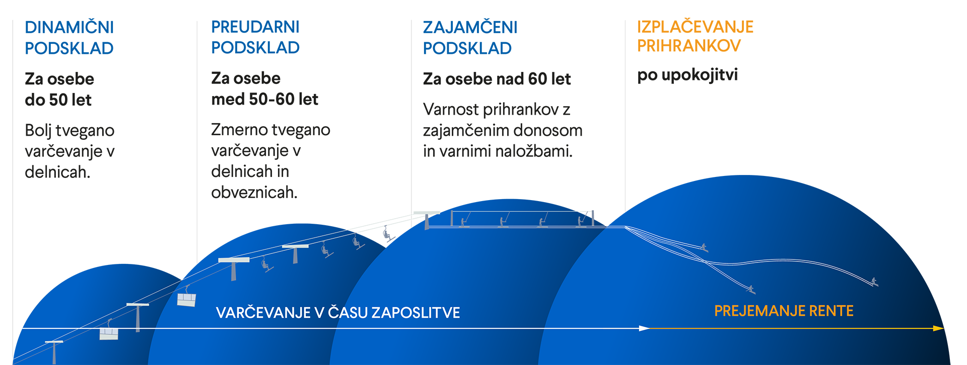 PRENESITE OBRAZECSklad, ki raste z vami ter se prilagaja zahtevam in zmožnostim vašega življenja. Zagotavlja vam prilagojene naložbe prihrankov glede na starost in naklonjenost tveganju. S staranjem varčevalca se prihranki premikajo skozi različne podsklade: dinamičnega, preudarnega in zajamčenega ter tako dosegajo dolgoročno optimalne donose. Sprememba podsklada pa je (z upoštevanjem, koliko ste stari) tudi vaša odločitev. Podskladi z različnimi naložbenimi politikami se vam prilagajajo in zagotavljajo višje donosnosti v času, ko je upokojitev še daleč in visoko varnost prihrankov v času pred upokojitvijo.